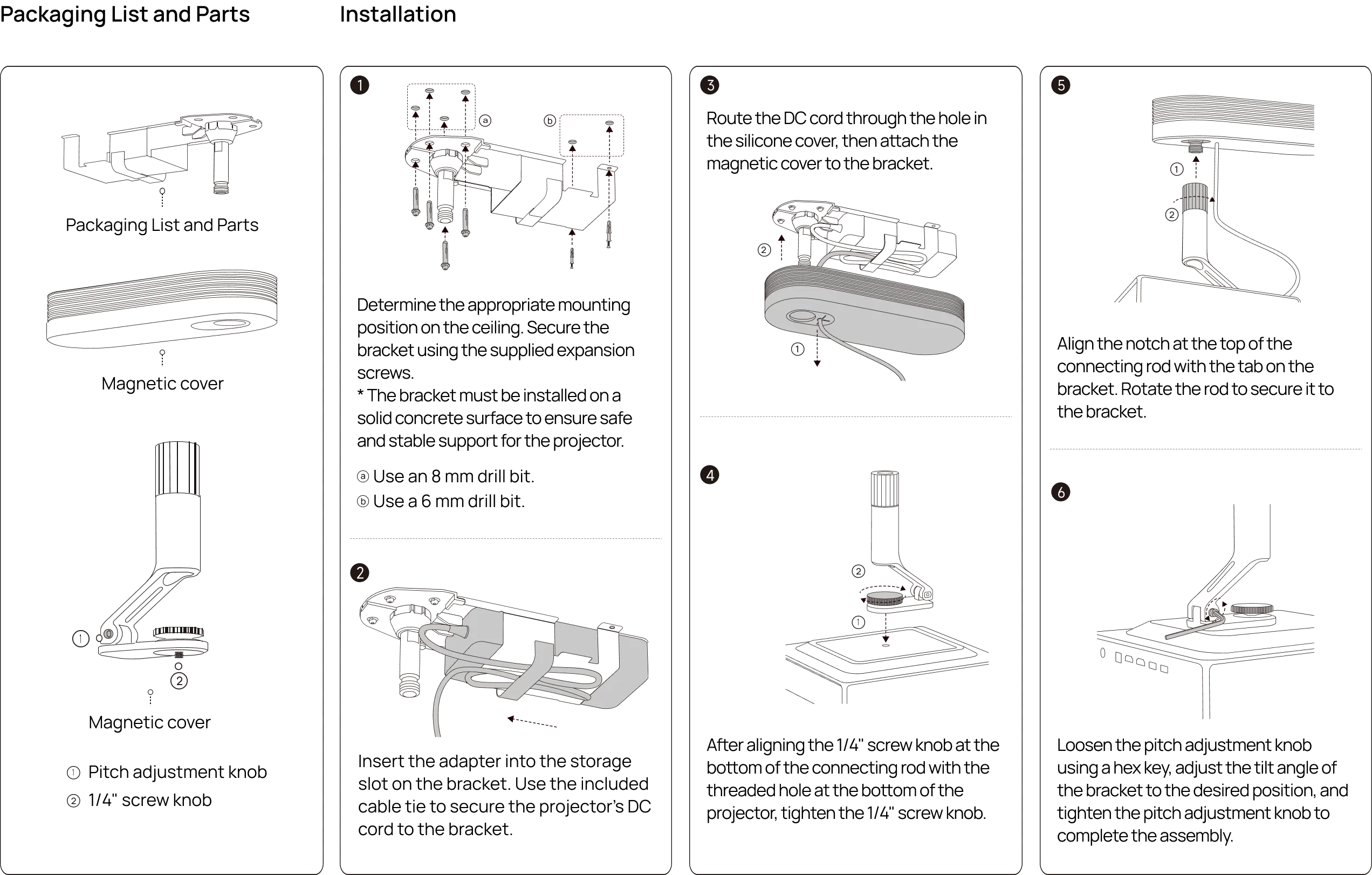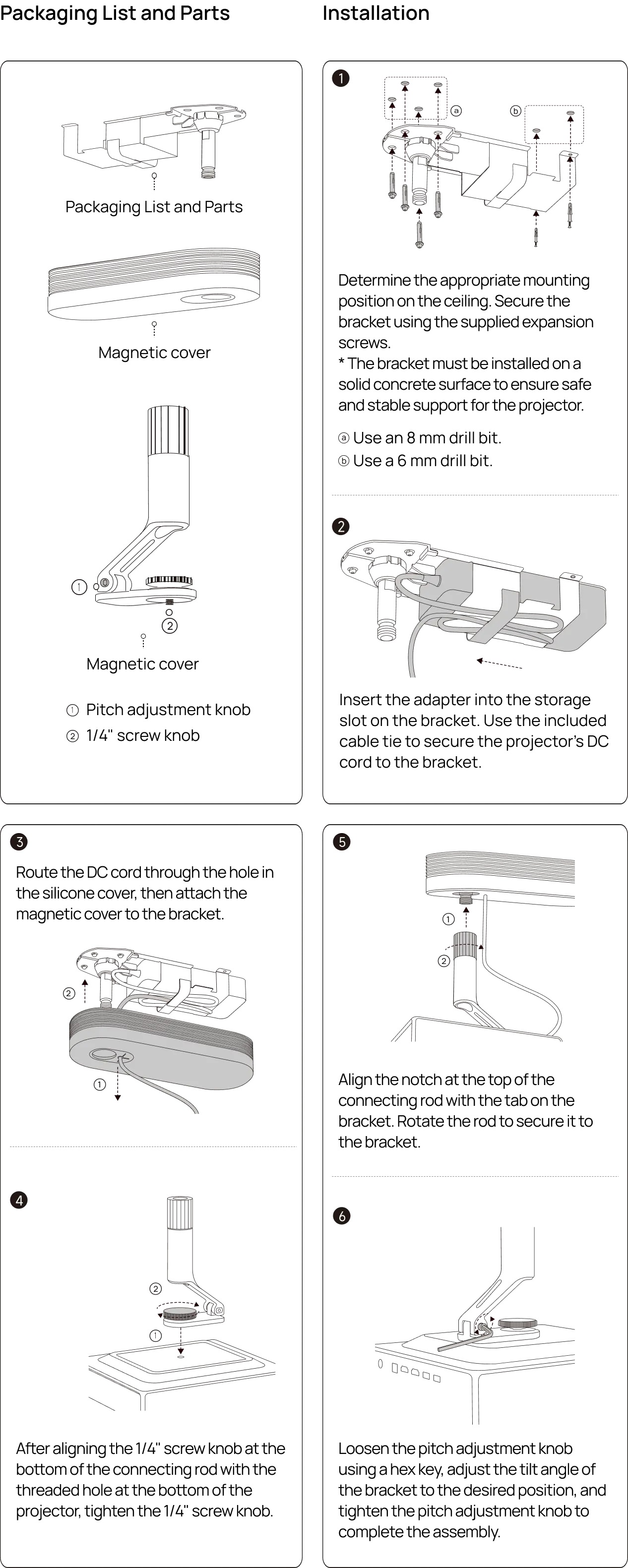 The product is designed for ceiling-mounted projectors and unsuitable for other non-ceiling-mounted scenarios, please read the 'Installation Guide' carefully before use.